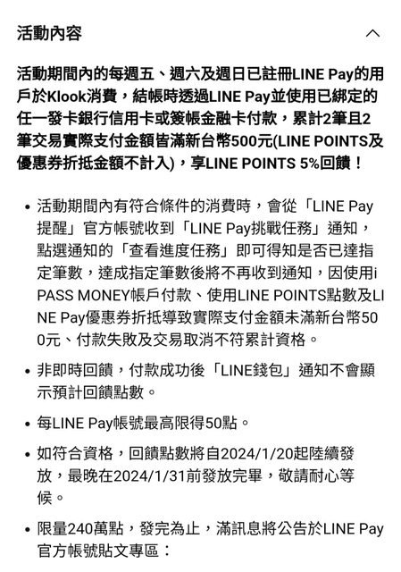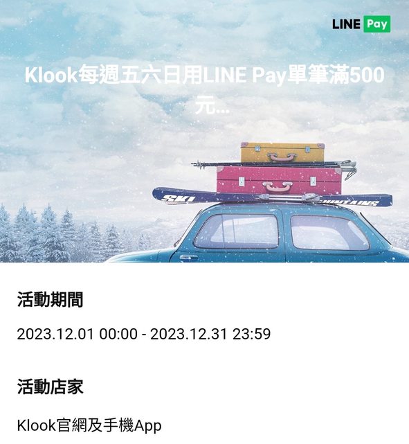 2023/12/01-12/31 的五六日期間於Klook消費滿500元以上*2次並且以Linepay付款