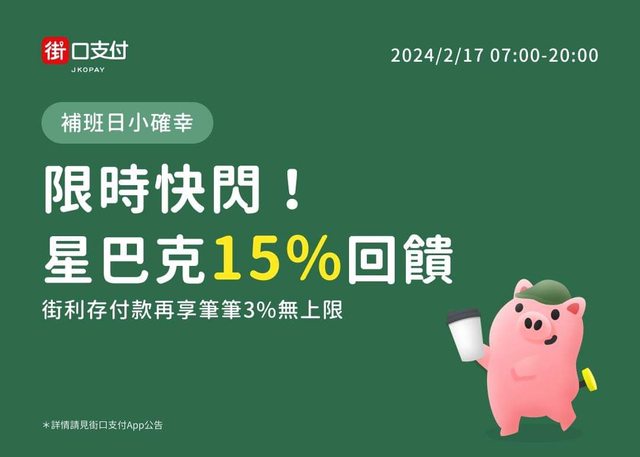 街口明天2/17 07:00-20:00於星巴克適用門市結帳回饋15%,每人限一筆,最高回饋50