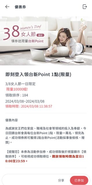 推 venter125: 優惠卷裡面沒有看到 42.71.194.188 03/08 12:07