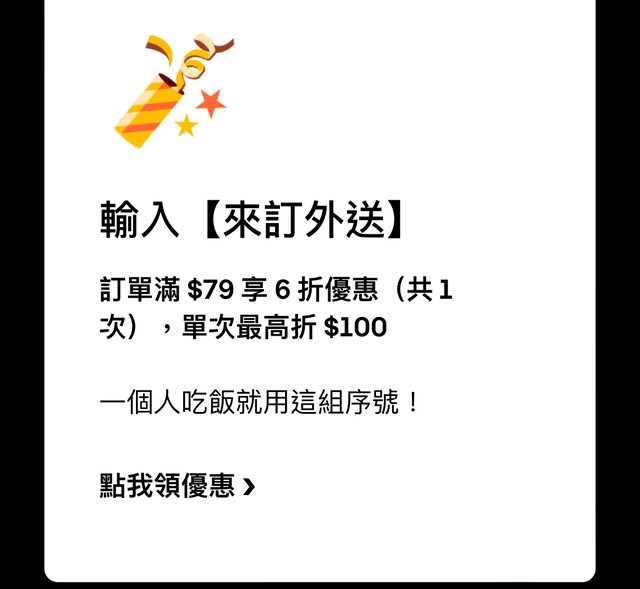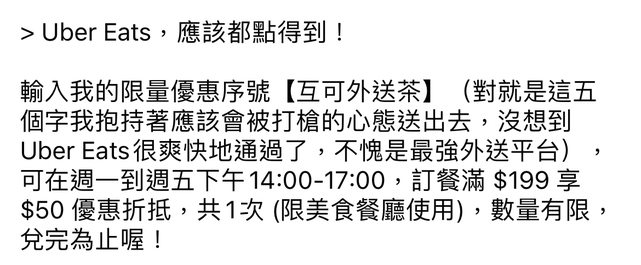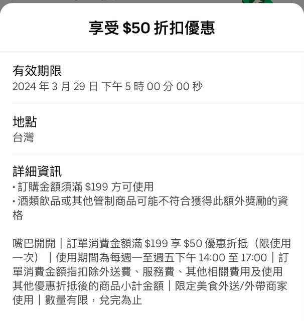 → iamhsg: 當下可套用-50優惠 但送餐時會被取消嗎? 163.21.176.253 03/20 12:34