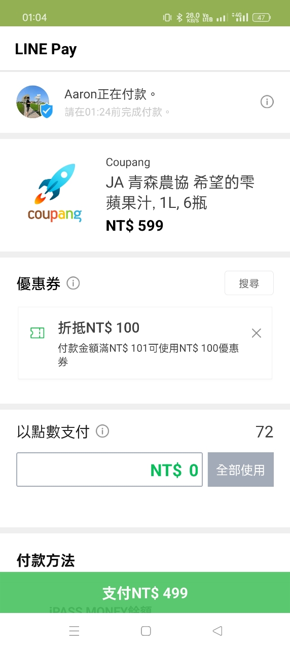 → aaronses7118: 酷朋錢100之後linepay再減100 共499 27.51.81.55 04/17 01:07