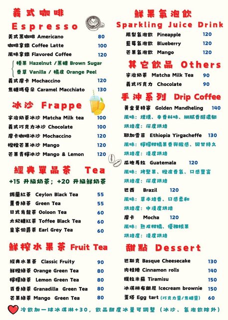 純茶55~60,奶茶90,咖啡80~130,氣泡飲120,冰沙100~120,水果茶80~90