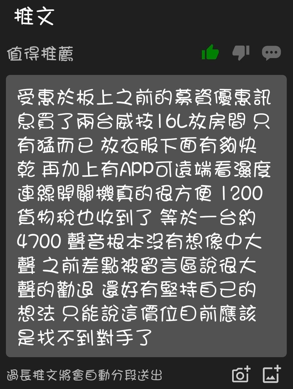 推 joey123xd: 威技台灣做的啊 暴力除濕 但很吵 客廳 101.12.17.19 05/07 11:24