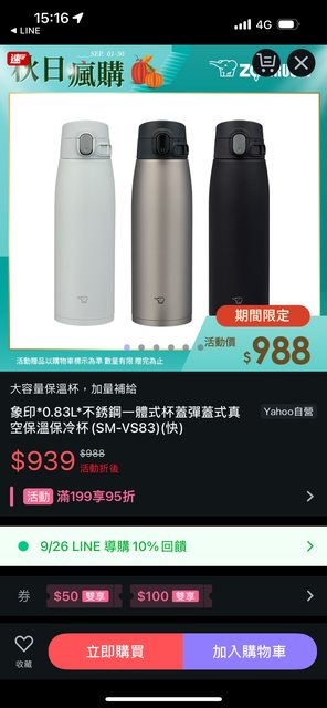 象印大容量保溫杯都能95折後再用888-100折價券