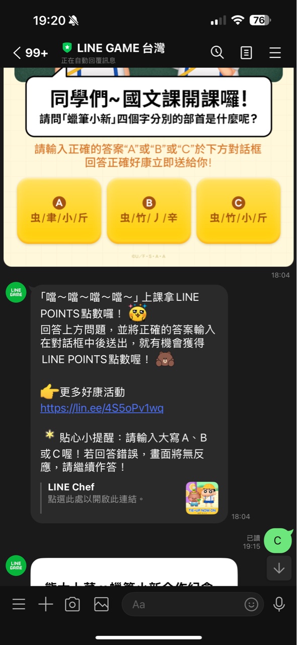 推 cerrutijeans: Line Game答案C 熊大上菜的 122.254.12.16 03/14 18:30