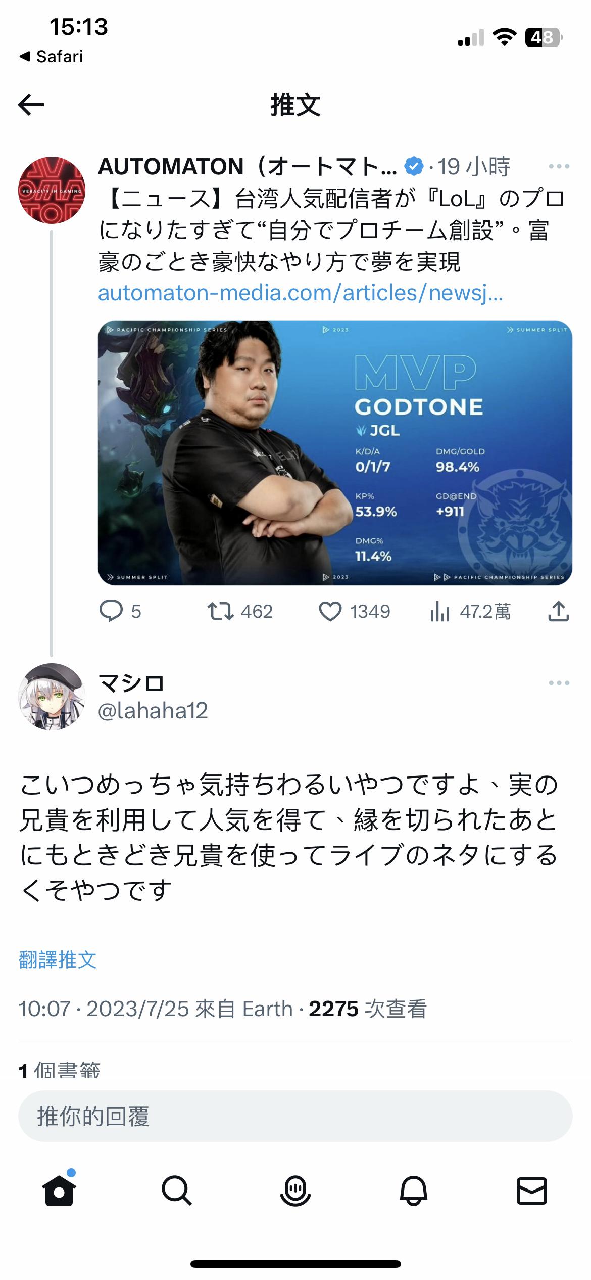 → sasaQQ : 原文寫KDA1.97 擊殺參與率57.3% 7/22打贏BYG 07/25 10:27