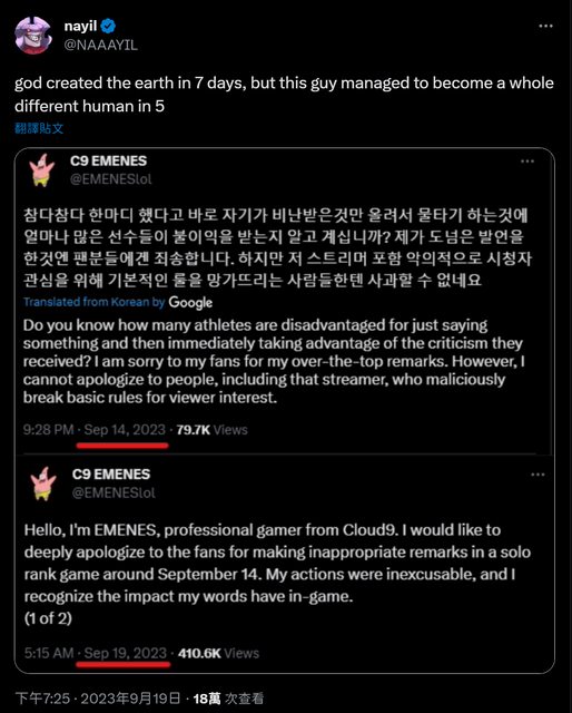 哈囉,我是 C9 的職業選手 EMENES。對於我在 9/14 一場 SoloQ 中發表的不當言論,我