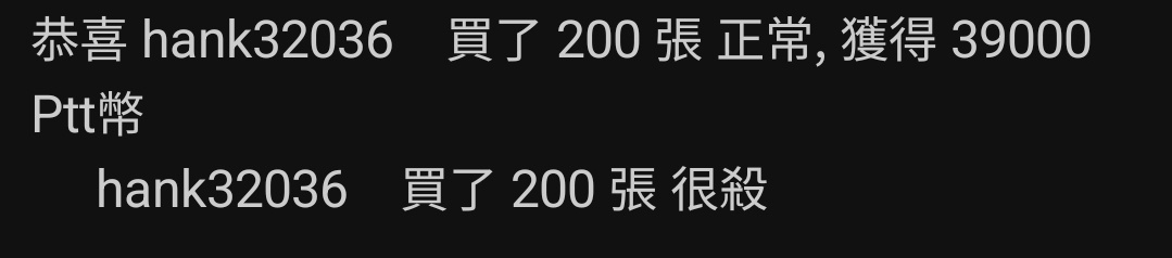 恭喜 hank32036 買了 200 張 正常, 獲得 39000 Ptt幣