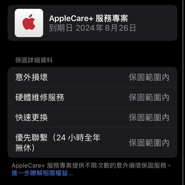 AppleCare+ 完整保固至 2024.8.26
