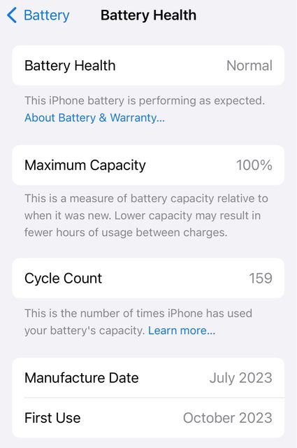 - 電池健康度100%,循環次數159次(截至發文當下)。