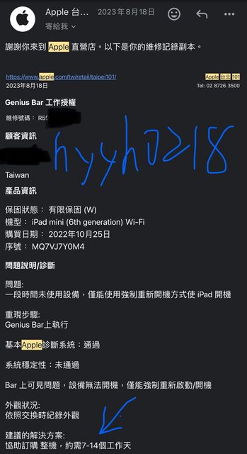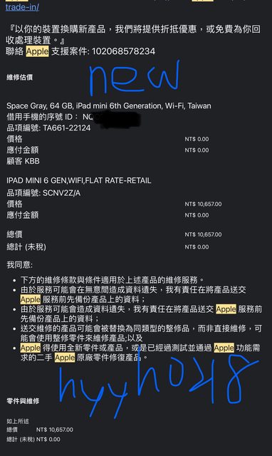 原本購入的 iPad mini 6 在 2023/8 時,出現電池問題,回 Apple 直營店送修後換整新機