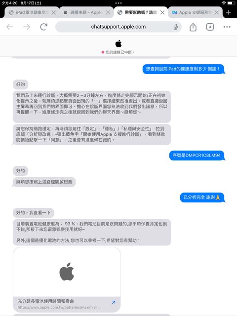 電池健康度在8/17於官方查詢為93%