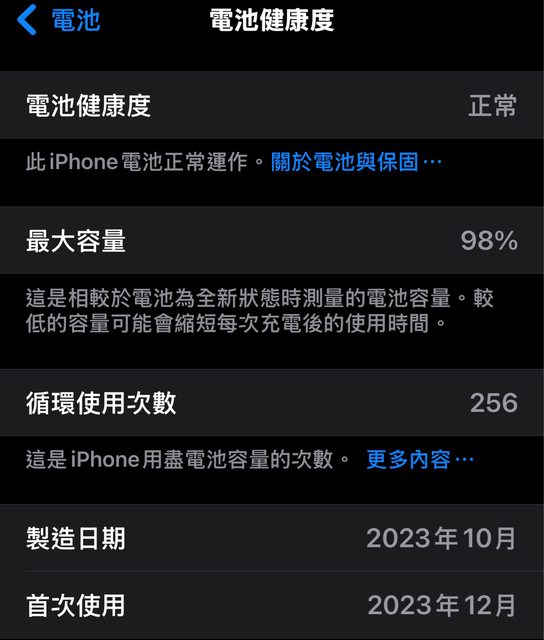 電池健康度98%,循環次數256次