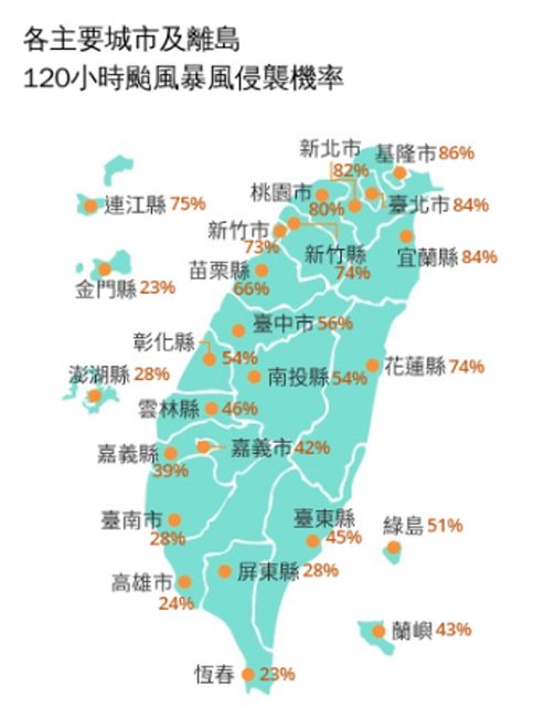 依據氣象署發布最新各縣市120小時受颱風7級暴風侵襲機率圖,基隆市侵襲機率有86%最