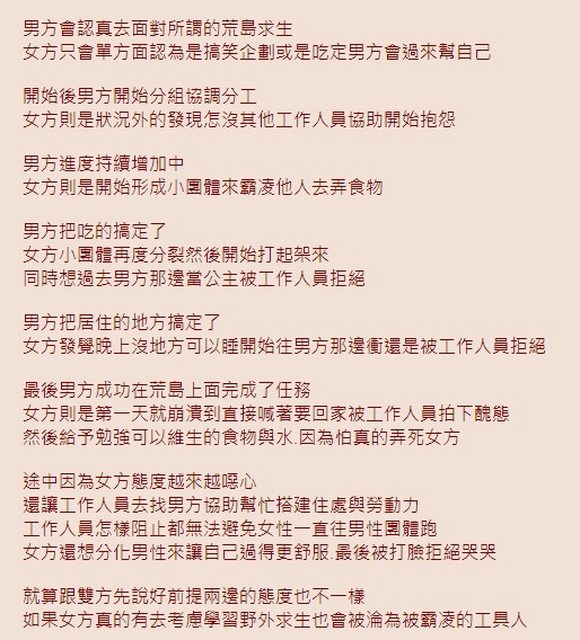 所以到野外全女會有這結果正常,畢竟一般女的普遍還是不喜歡體力勞動,可是全女環境還