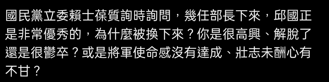 推 aegis43210 : 國防部長主要管軍備的,看新部長能不能用文人的眼光 04/17 17:41