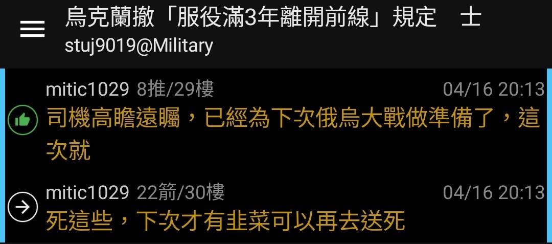 噓 leviliang : 我就他媽的不懂為啥軍武版一堆平民老百姓要挺烏克 04/20 14:09