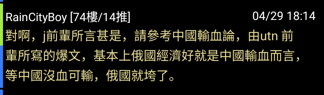 → RainCityBoy : 輩所寫的爆文,基本上俄國經濟好就是中國輸血而言, 04/29 18:14