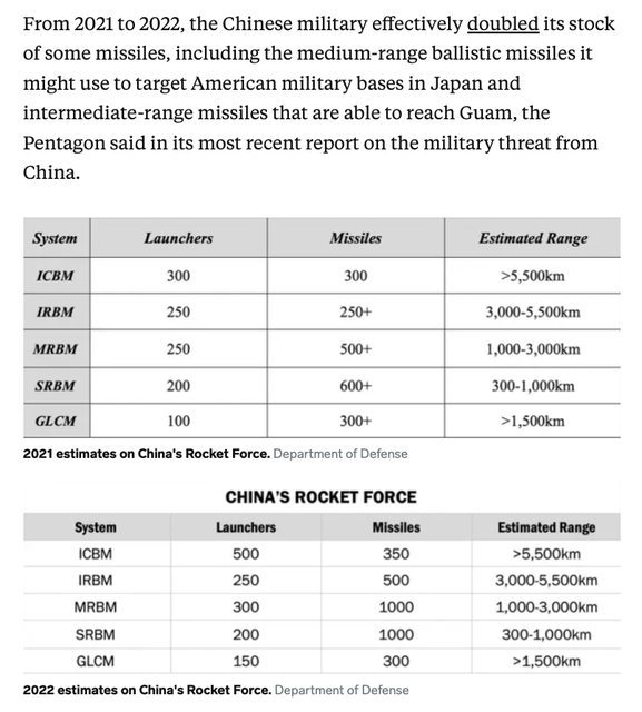 五角大廈在報告中表示,從2021年到2022年,中國軍隊的一些飛彈庫存實際上增加了一倍