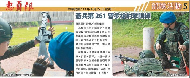 根據國軍憲兵“忠貞報”於四月所報導的內容,憲兵202指揮部261營四月時開始訓練下部隊 的一年期役男,而這個憲兵營是全民國防兵力結構調整方案後新編成的四個憲兵營(261—2 64)之一。 需要注意的是,雖然憲兵營為“新編“,使用的步槍卻是1978年生產最原始版本的T65而非T 65K1和T65K2,而這也披露了這次新編四個憲兵營的裝備來源。 https://i.imgur.com/J5QOe07.jpeg