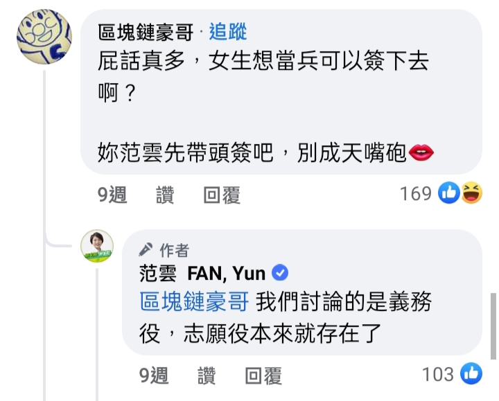 推 kimo21801 : 台女:人家是女森欸,為什麼需要當兵保護國軍 05/23 20:41