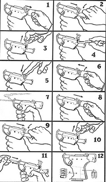 如前所述,M3衝鋒槍最容易發生故障的部位是槍機曲柄,一旦損壞就不能上膛擊發。