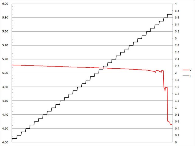 ▼USB-C埠的固定檔5V輸出負載測試,隨著電流增加,輸出電壓下降,輸出電流超過3.5A