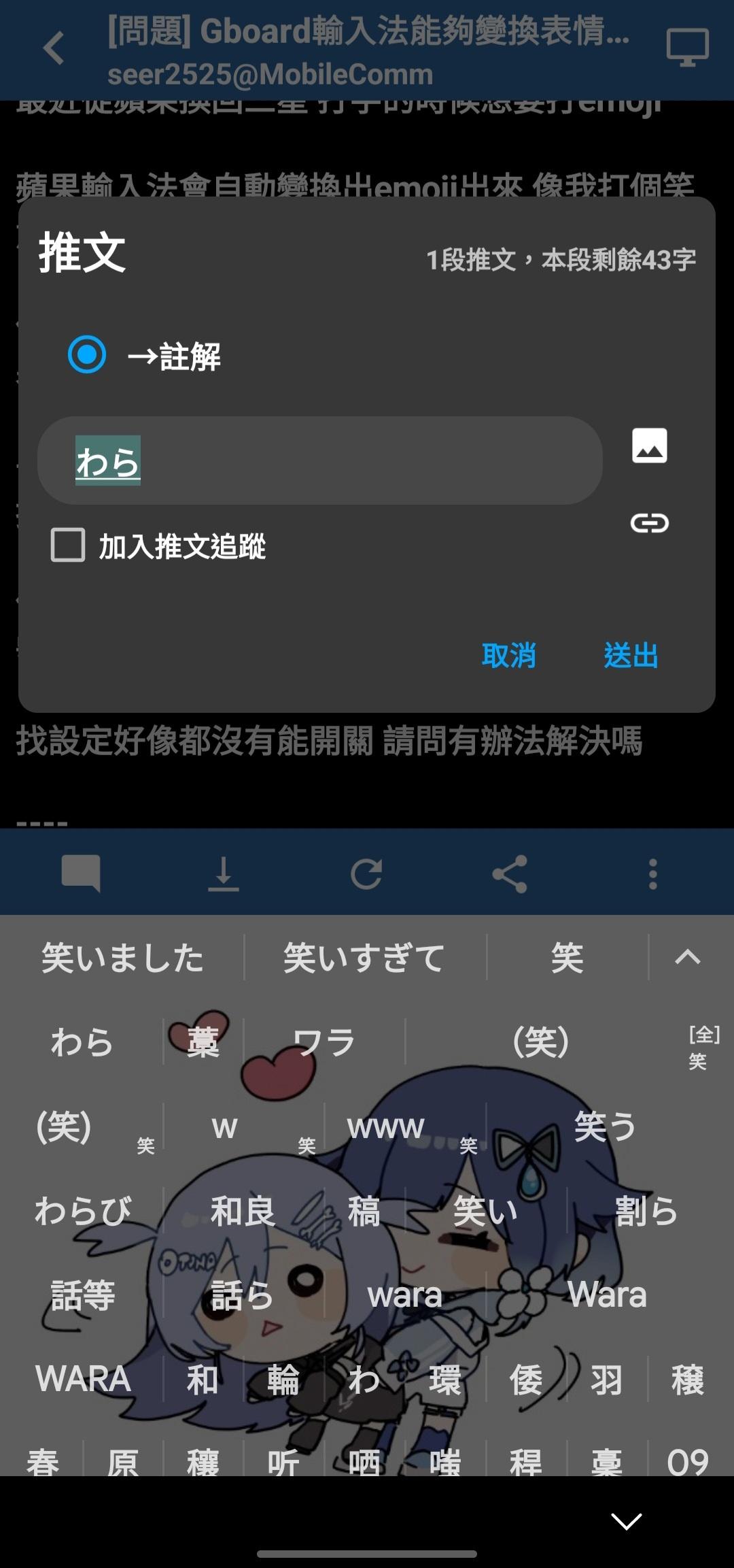 → rex510 : 看一下設定裡面有一個表情符號-->輸入時顯示建議, 04/23 22:27