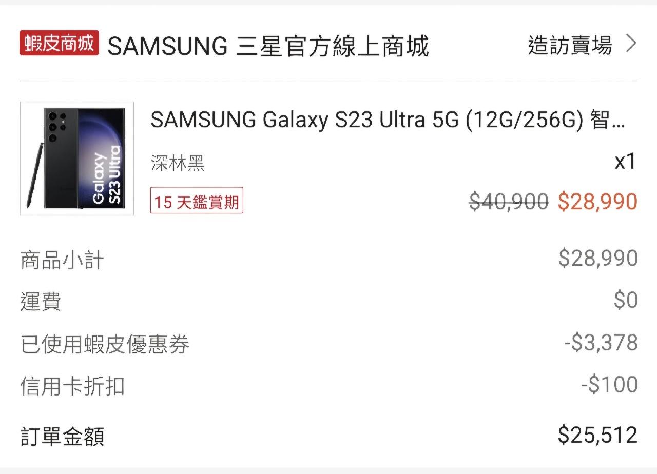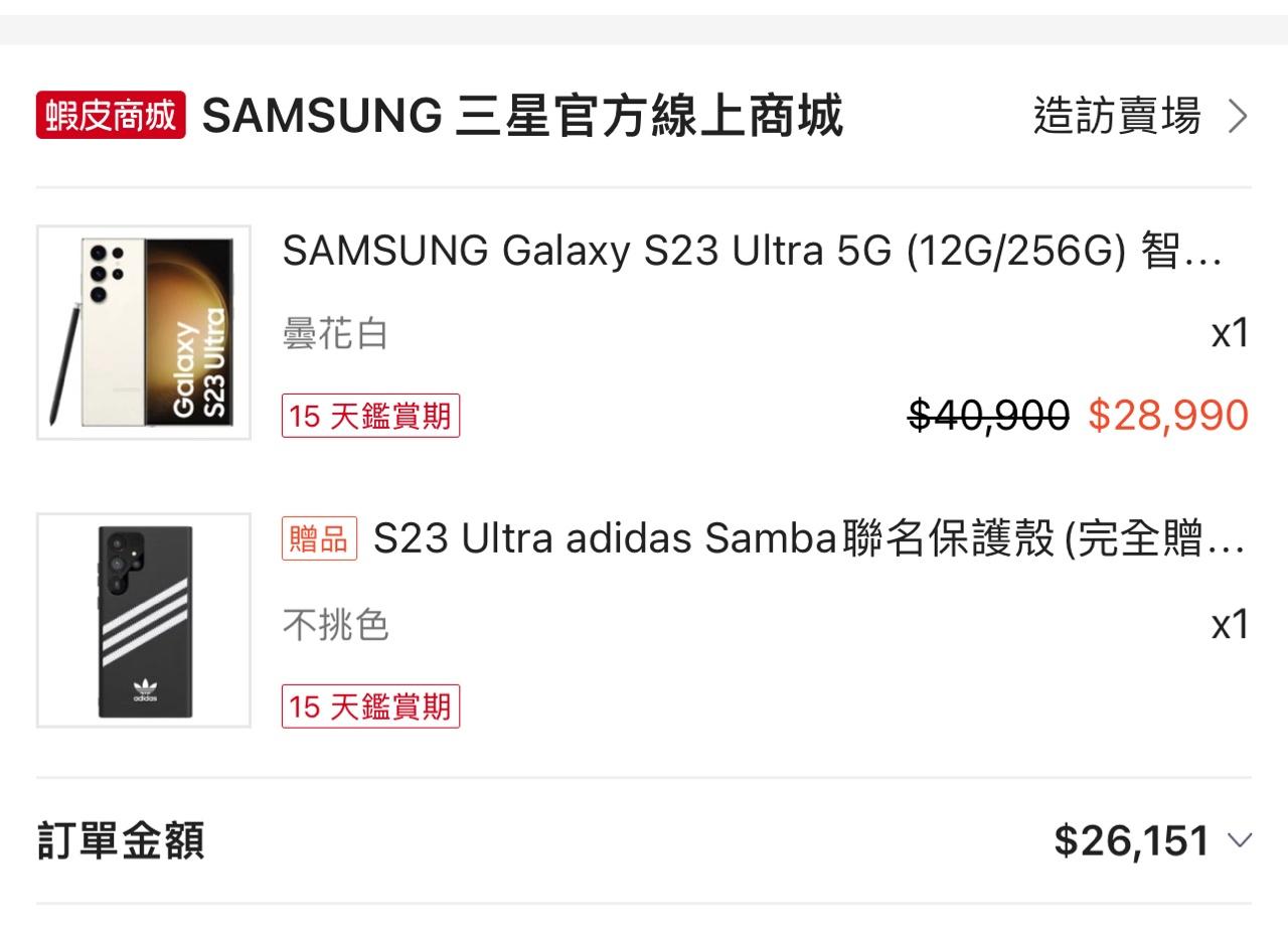 推 bye2007 : 昨天蝦皮三星商城S23u折價後26XXX送愛迪達保護殼。 04/26 06:44