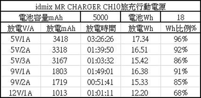 比例96%(5V/1A),最低可用Wh比例68%(12V/1A),5V/3A放電3167mAh超過規格標示2880mAh