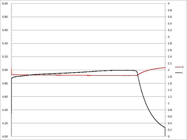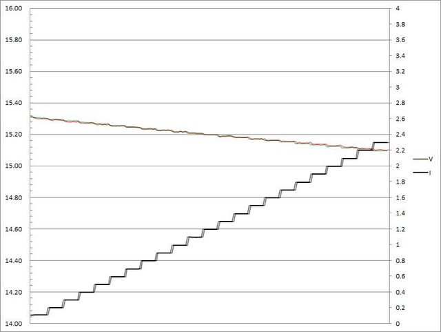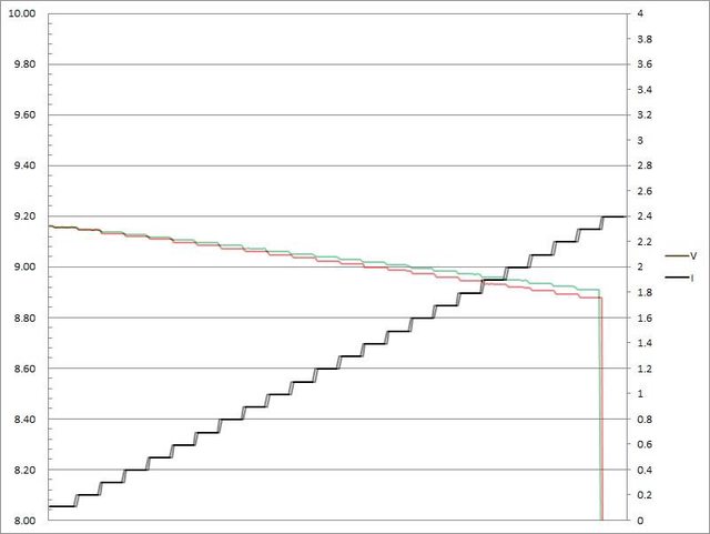 電壓下降,輸出電流超過2.3A大幅壓降,超過2.4A截止