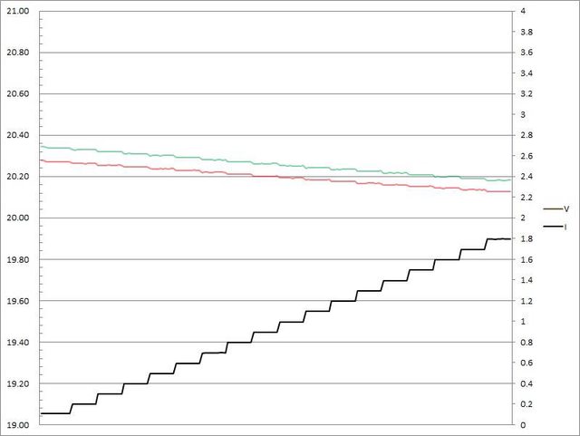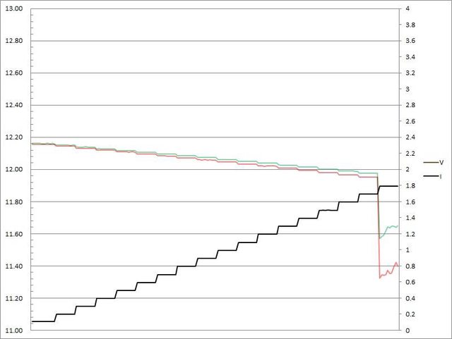 出電壓下降,輸出電流超過1.7A壓降,超過1.8A截止