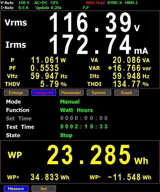 ▼使用交流對電池充電時,最高消耗功率達11W,從耗盡至充飽耗時2小時19分,輸入能量