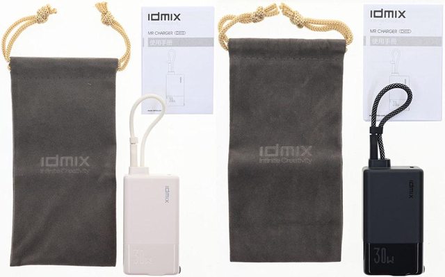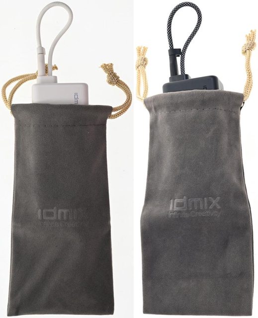 ▼包裝內容,有印上商標的絨布袋、米白版(左)與黑色版(右)IDMIX MR CHARGER CH10