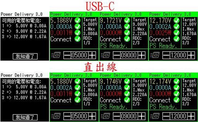 ▼充電器模式下USB-C(紅)/直出線(綠)的固定檔12V輸出負載測試,隨著電流增加,輸出