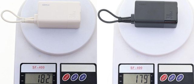 ▼米白版(左)與黑色版(右)IDMIX MR CHARGER CH10 Chill豆腐 30W雙模行動電源重量182