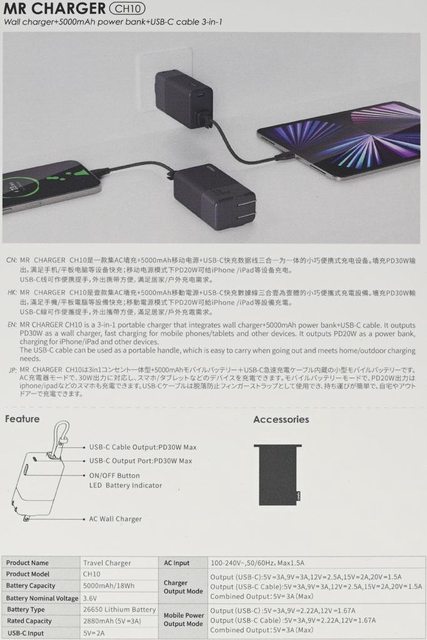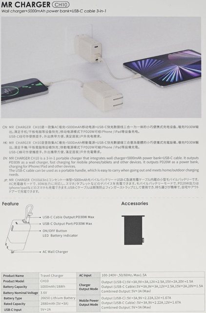 規格、充電器模式輸出規格、行動電源模式輸出規格、設計/製造商、產地(中國)、認證