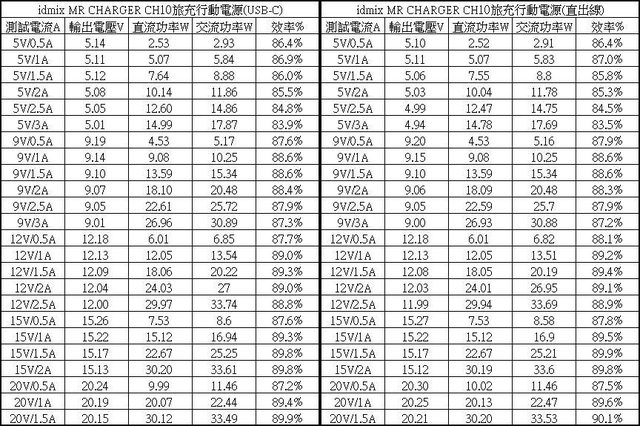 ▼充電器模式下於電池完全充飽時USB-C(左)/直出線(右)單獨輸出的各組輸出轉換效率表