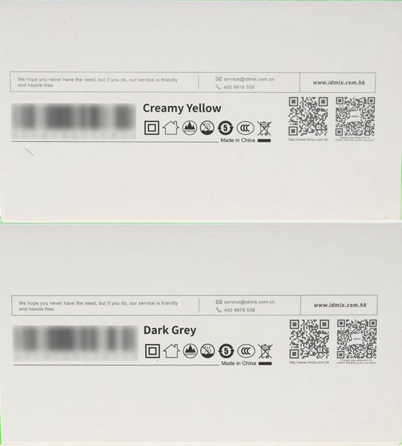 ▼米白版(上)與黑色版(下)外盒底部有原廠網址、條碼、顏色標示、認證標誌、產地(中