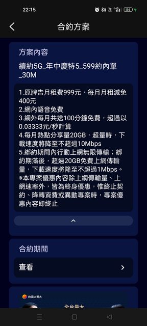 上為合約內容 是去年初跟台灣之星續的一個599 5g吃到飽不限速的方案 但年底時台灣之星就被台哥大合併了 合併後也有打來找我談續約並且廢掉目前合約內容 但我發現他的合約內容沒有5g吃到飽就拒絕了 但我在剛才才發現 http://i.imgur.com/hOmj6sw.jpg