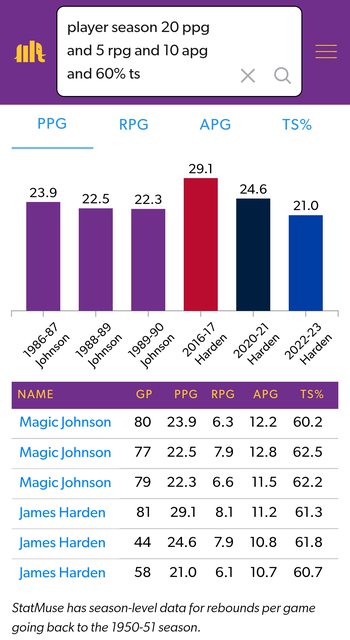 消息來源: https://twitter.com/statmuse/status/1691910291322449945 內容: The only player over the last 30 seasons with 20+ PPG 5+ RPG 10+ APG 60+ TS% in a season... The Beard has done it 3 times. 在過去30年內,只有一位球員達成單季 20分 5籃板 10助攻 60%真實命中率 登登,達成三次。 短評或心得: 登登的數據真的是滿猛的,希望他還是能好好打球。 我用statmuse網站查,除了登登,也只有魔術強森達成過,也是三次。 http://i.imgur.com/TgdILV7.jpg