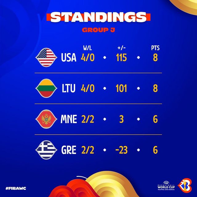 : 美國及立陶宛皆4勝,雙雙晉級,禮拜天對戰決定誰是小組第1。