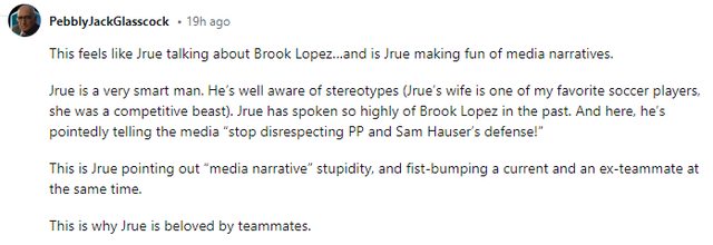 大意就是有點對媒體的逆反心理,畢竟運動媒體對NBA的白人運動員普遍印象就是防守差