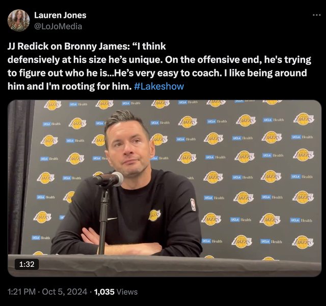 Lauren Jones the sporting tribune JJ Redick on Bronny James: “I think defensively at his size he’s unique. On the offensive end, he's trying to figure out who he is…He’s very easy to coach. I like being around him and I'm rooting for him." JJ Redick 談到Bronny James時說: 「我認為在他的身高下,他在防守上很有特色。在進攻端,他還在尋找自己的定位... 他非常容易教導。我喜歡和他相處,我也很支持他。」 備註 今天的highlight 進攻 https://i.imgur.com/jy8xOGo.gif
