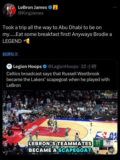 https://x.com/kingjames/status/1842585652699013203?s=46 LBJ轉推塞爾提克轉播單位說龜龜在湖人成為LBJ的代罪羔羊: 我去了一趟阿布達比在我的…先吃早餐吧,不管怎樣,龜龜是個傳奇 短評或心得: 傳奇! -- ※ 發信站: 批踢踢實業坊(ptt-web.org.tw), 來自: 111.248.70.196 (臺灣) ※ 文章網址: https://ptt-web.org.tw/NBA/M.1728144001.A.E56