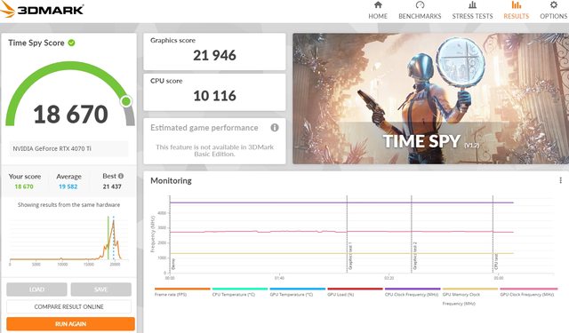 用3dmark去跑,請忽略我的CPU真的很廢,這張RTX4070TI跑出了21946分,接著就來測試