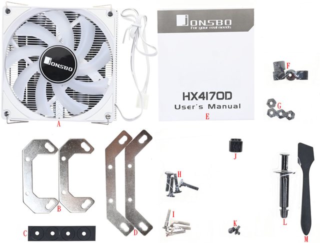 LGA1700專用銀色螺柱(I)、固定螺帽套筒工具(J)、托架固定螺絲(K)、暴力熊散熱膏(L)