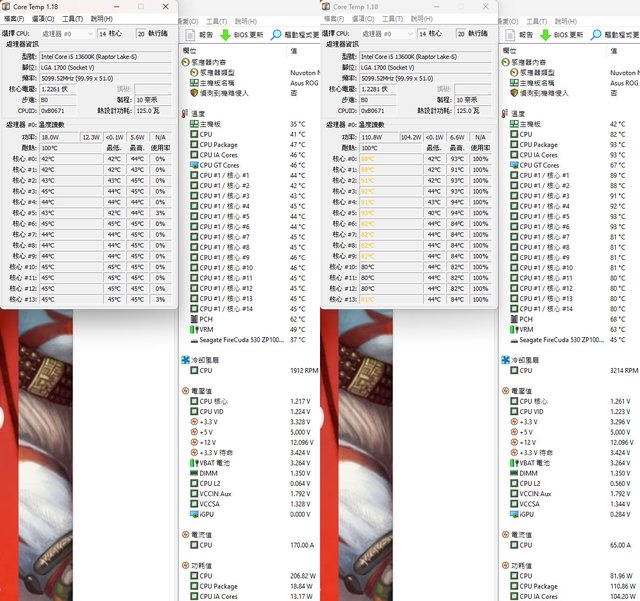 ▼待機(左)及高負載(右)的CORE TEMP及AIDA64感測器畫面