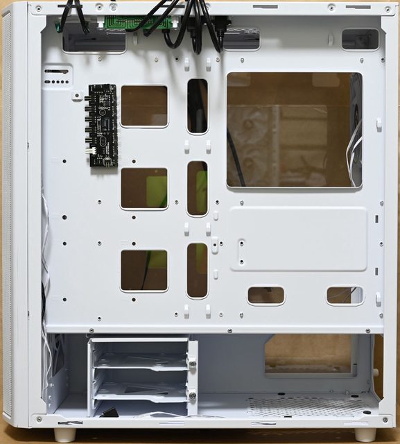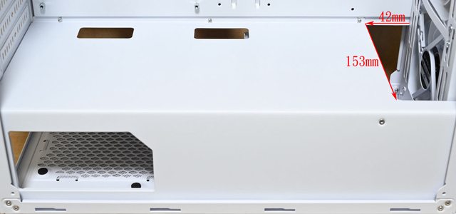 ▼電源艙側邊開口可看到電源供應器側面,頂部靠近底板處有2個長方形穿線開口,前方
