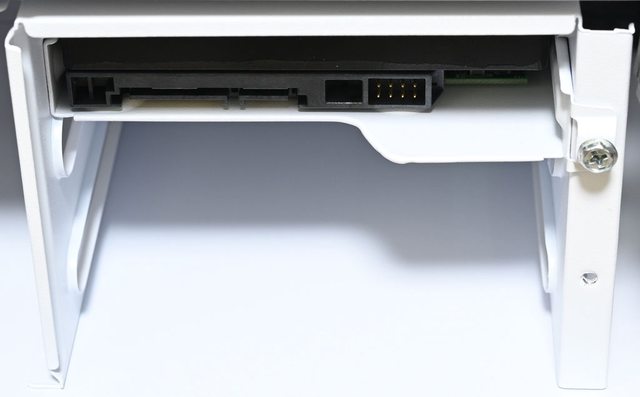 ○底部固定架具備2個抽取式托盤,可安裝2個3.5吋硬碟/2.5吋SSD,底板正面前方可安裝